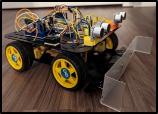 ultrasonic and line-following sensors, to navigate its environment. The ultrasonic sensors detect obstacles,